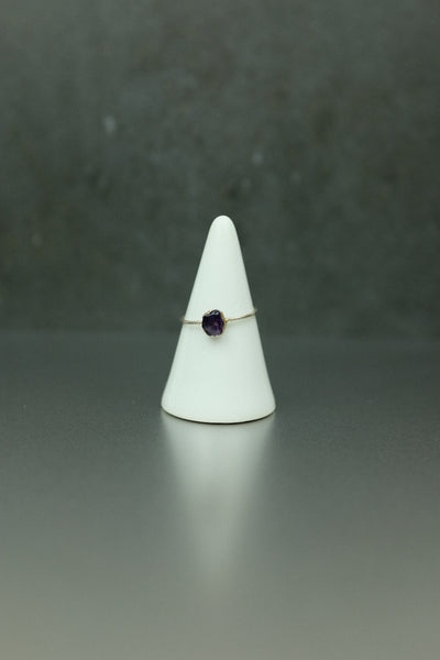 The amethyst stone measures approximately 6mm long, 4mm wide, and 4mm tall. Wear it alone for an elegant touch or stack it with others.