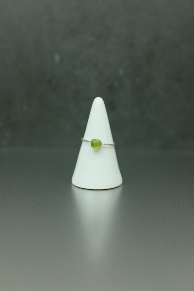 The peridot stone measures approximately 4mm long, 4mm wide, and 3mm tall. Wear it alone for an elegant touch or stack it with others.