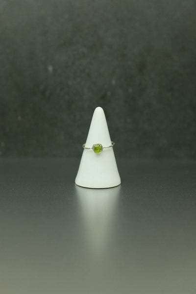 The peridot measures approximately 5mm long, 5mm wide, and 3mm tall. Wear it alone for an elegant touch or stack it with others.