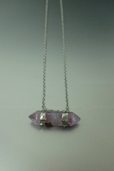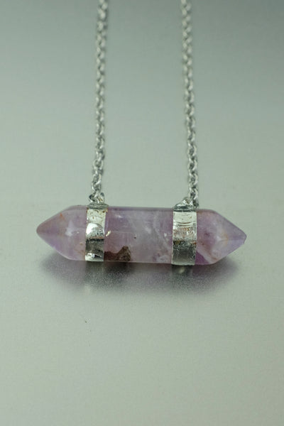 Deep violet and quietly powerful, this Amethyst necklace features a double terminated crystal point designed to symbolise balanced energy and spiritual clarity. The natural stone is finished in a silver-tone metal setting and suspended from a simple chain, allowing the crystal to remain the focus.
