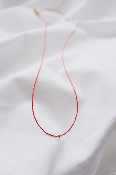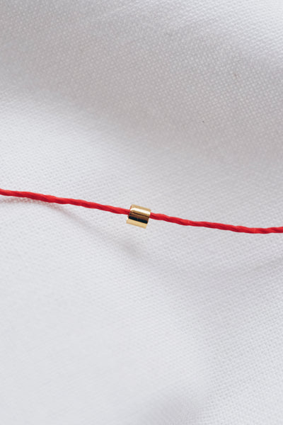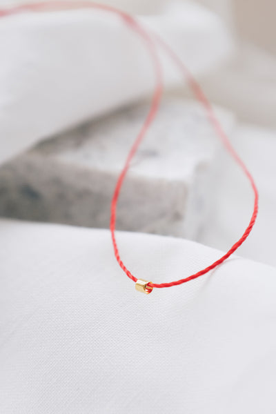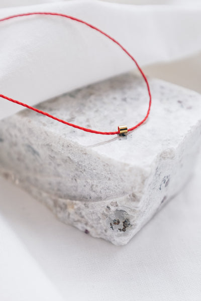 Introducing our Handmade Gold Tube Red String Necklace, ethically made without plastic. Featuring a striking gold tube threaded onto a vibrant red string, this minimalist necklace is packed with cultural symbolism and energetic intention.