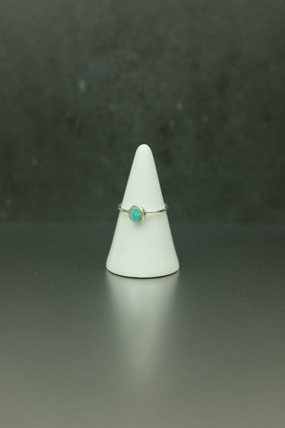 The turquoise stone measures approximately 5mm long, 5mm wide, and 3mm tall. Wear it alone for an elegant touch or stack it with others.