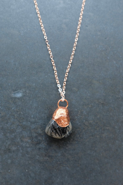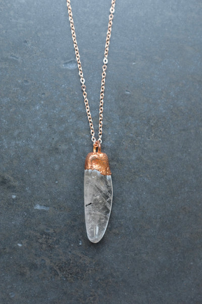 A copper rutilated pendent, hanging from a 20" rose gold plated necklace.