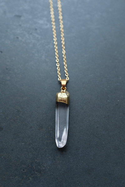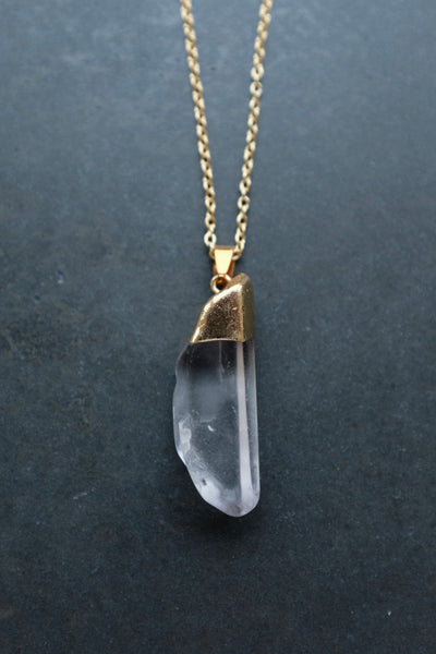 A gold plated quartz pendent, hanging from a 24" gold plated necklace.