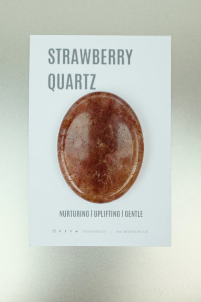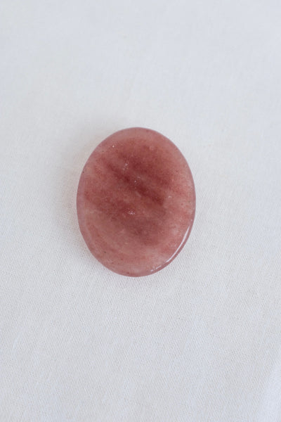 A polished Strawberry Quartz thumb (worry) stone—perfectly palm-sized (approx. 3–4 cm), with a thumb groove for comforting tactile use. This rosy-hued crystal blends emotional healing, calming energy, and heart-centered clarity—an ideal companion for daily stress relief and self-love rituals.